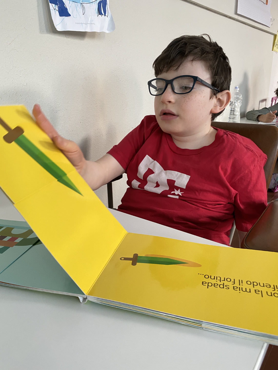 Orlando sfoglia libri in parziale autonomia e con coinvolgimento; partecipa con efficacia alla successione delle attività previste e, se particolarmente interessato all’oggetto di lavoro, riesce a mantenere il contatto visivo con lo stesso, con migliorata costanza.