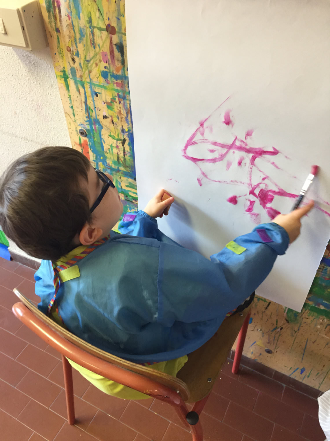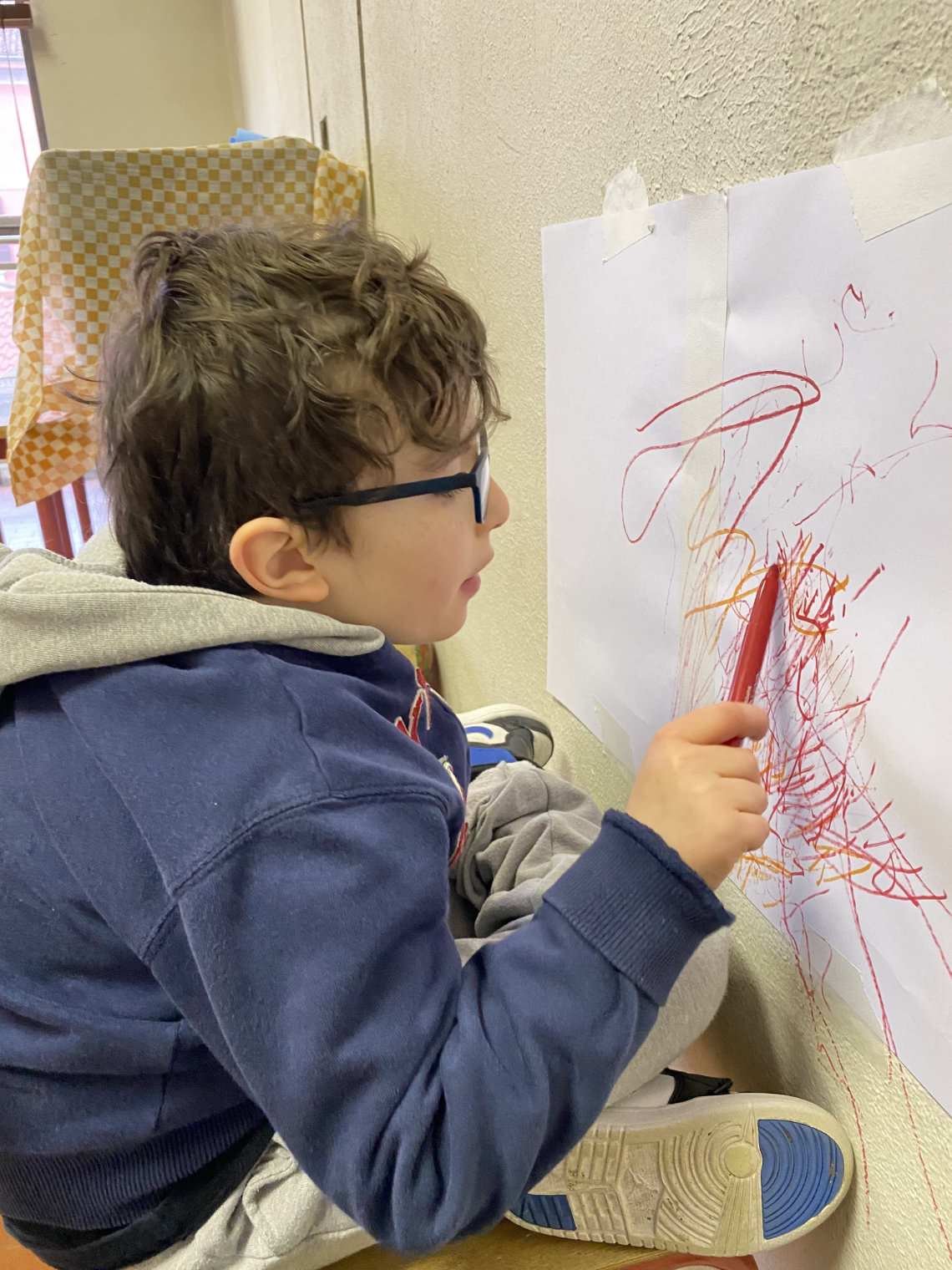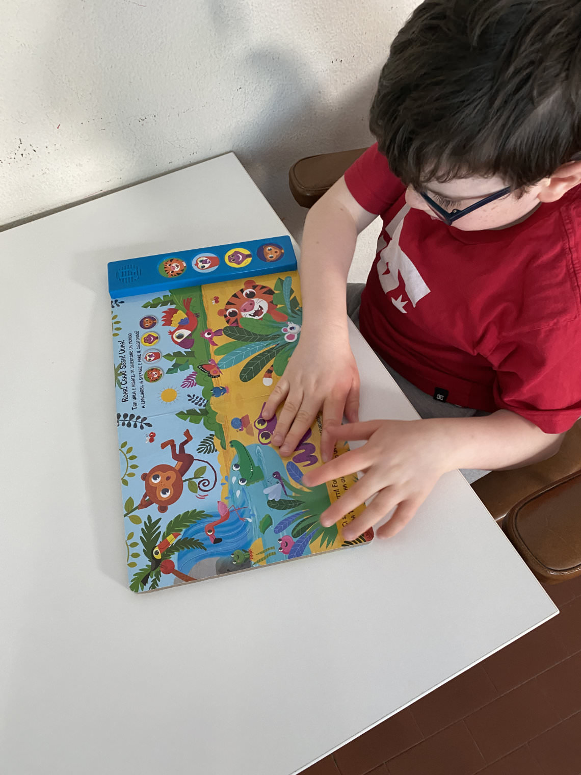 Oggi Orlando partecipa alle attività prestando più attenzione. Inoltre, si lascia guidare volentieri durante la produzioni di alcuni lavori ed è possibile metterlo per qualche minuto al tavolino dove riesce ad abbassare lo sguardo verso il foglio e a lasciare, se guidato, piccole tracce di colore. Si avvicina spontaneamente al pannello sensoriale e tocca i vari materiali spostando la mano da un oggetto all’altro.